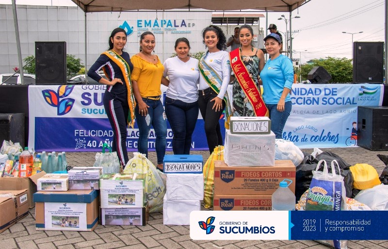 Susana Herrera, presidenta de Sucumbíos Solidario, conformó brigadas con personal voluntario y el acompañamiento de la reina del cantón y la provincia. Se trasladaron a varios puntos de la ciudad, donde recolectaron donaciones de los lagoagrenses.