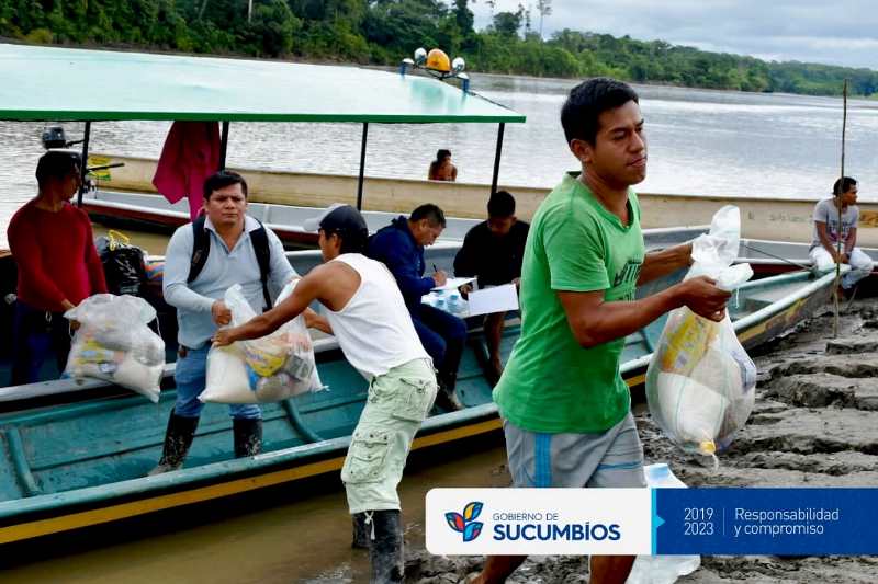 Sucumbíos Solidario entregó raciones alimenticias a las familias afectadas por la inundación del 22 de junio del 2019, debido al desbordamiento del río Aguarico, que azotó la comunidad Kofán Zabalo, cantón Cuyabeno.