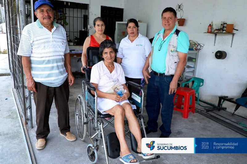 Eufemia Jiménez, quien tiene una afectación en los pulmones y cansancio físico, y Gloria Tipán, con amputación en la pierna derecha debido a la diabetes, recibieron sillas de ruedas que entrega Sucumbíos Solidario a personas con enfermedades catastróficas y de bajos recursos económicos.