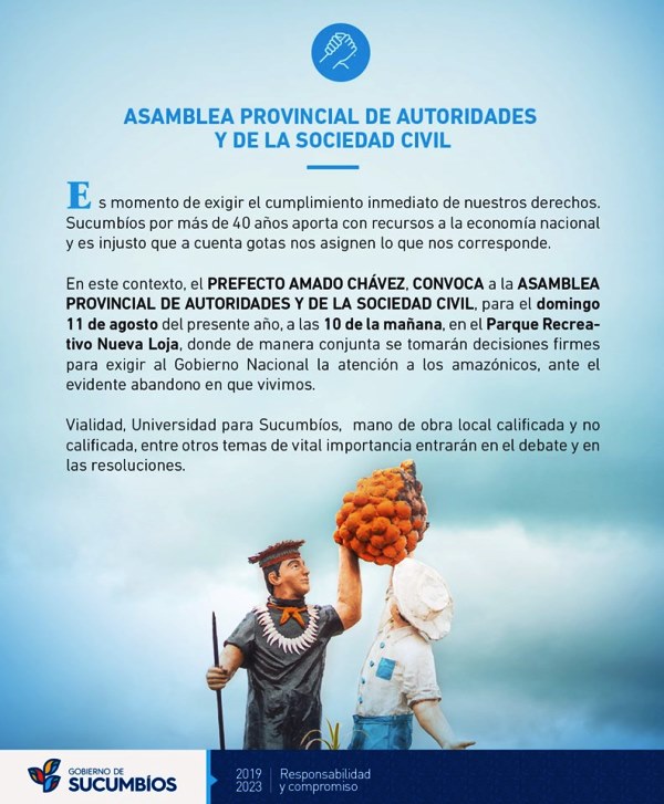 El prefecto Amado Chávez, convoca a la GRAN ASAMBLEA PROVINCIAL por los derechos de Sucumbíos.