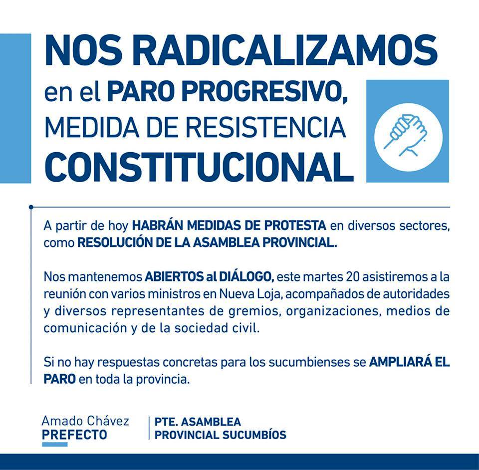 El señor prefecto Amado Chávez, anuncia que se RADICALIZA la MEDIDA DE RESISTENCIA CONSTITUCIONAL. Este martes, DIALOGARÁN con los ministros y en caso de no haber respuestas concretas para los sucumbienses, se AMPLIARÁ el PARO.